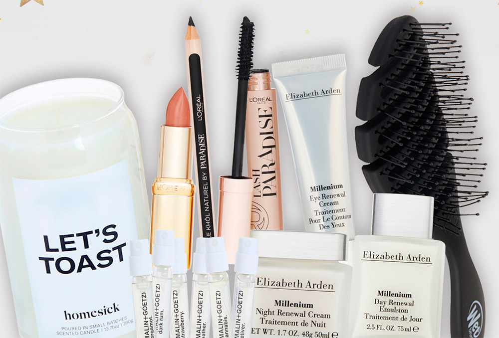 Multi-brand kit with skincare, makeup, hair and home fragrance.
